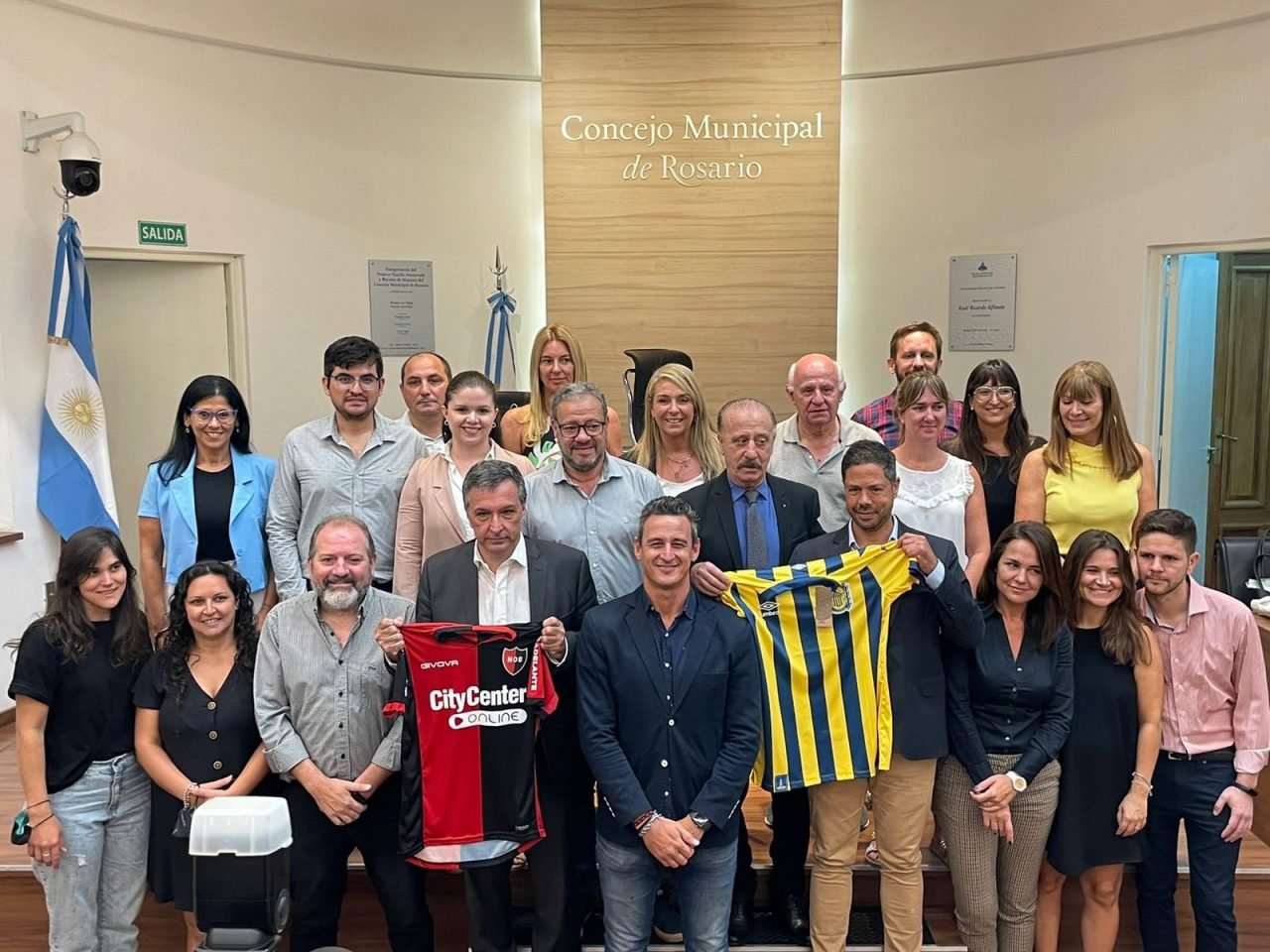 El encuentro fue convocado por los concejales rosarinos -entre los que se hallan el ex jugador de Central Aldo Pedro Poy y el periodista “rojinegro Ciro Seisas-, quienes se reunieron esta mañana con los titulares de ambos clubes, con los que posaron en una foto grupal con las camisetas de Central y Newell’s.